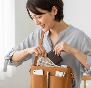 「それだけで足りるの?」と不安に思うかもしれませんが、そこでもう一つの財布の出番です。スマホショルダーには「今日使う分」だけを。そしてバッグの中のメイン財布には「もしもの時のお金」や「重要な書類」を。この役割分担こそが、ミニマリズムの軽やかさと、主婦としての安心感を両立させる正解なんです。