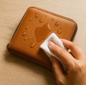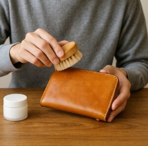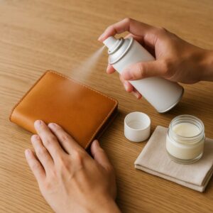 - 防水スプレーをかける: これが一番重要です。特にヌメ革は無防備なので、フッ素系の防水スプレーで「バリア」を作ってあげましょう。水シミや汚れが直接染み込むのを防いでくれます。