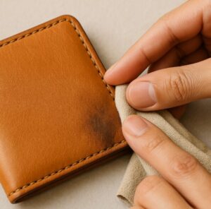 手垢と並んで怖いのが「水シミ」ですね。特にタンニンなめしの革は、水をすごく吸いやすい性質があります。